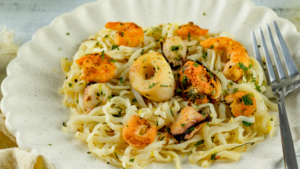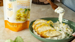 Ingredientes: 1 pct de Fettuccine konjac100g de cream cheese3 dentes de alho amassado½ cebola pequena picadaRaspas se ½ limão sicilianoManjerona