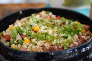 Ingredientes: 1 pacote de arroz konjac80g de linguiça angus 20g de bacon em cubos pequenos½ de cebola2 dentes de alho1
