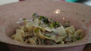 Ingredientes: 1 pacote de papardele de konjac2 dentes de alho20g de cebola roxa15g de alho poró100g de cogumeloPapardela de konjac30ml