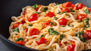 INGREDIENTES: 1 pacote de Konjac Bucatini 120g de tomate cereja 40g de creme de leite ½ xícara de folhas de