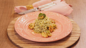 Ingredientes – 1 pacote de espaguete Konjac– 150g de filé de camarão– sal– pimenta– 120ml de azeite– 1 maço de