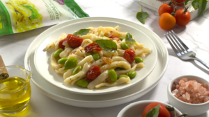 Ingredientes 1 pacote de penne Konjac 20 unidades de tomate cereja50g de edamame3 dentes de alho fatiadoSal, pimenta, manjericão e