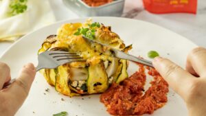 Ingredientes: 1 pacote de lasanha konjac1 abobrinha brasileira ou italiana 500g de Ricota amassada1 maço de espinafre sem os talos