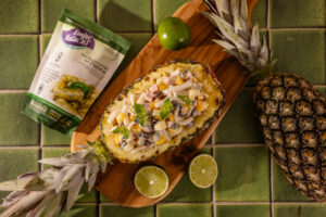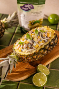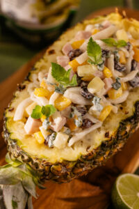 Combinando nossa Konjac Massa tipo Penne com abacaxi, peito de peru, hortelã e um cremoso molho especial, o resultado é um prato que fica lindo servido no próprio abacaxi. A cara do Natal, só que mais saudável.
